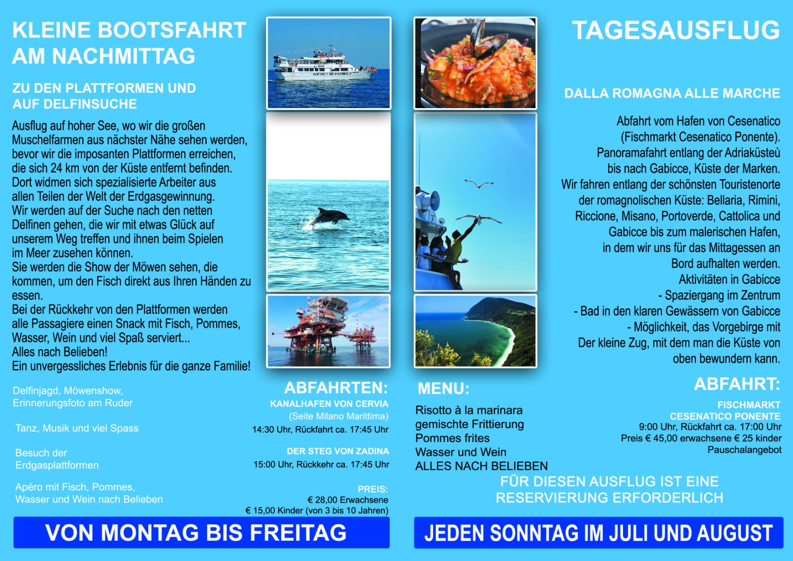 Una bellissima esperienza al largo dando da mangiare ai gabbiano, vedendo le piattaforme in mezzo al mare ma soprattutto incontrando i delfini. Tre ore in mezzo al mare, un’esperienza da far vivere anche ai bambini!